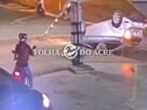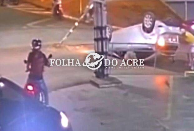 Professora aposentada capota veículo após colidir contra placa de sinalização no centro de Rio Branco